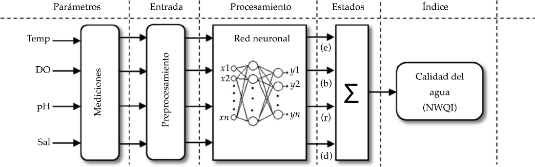 Figura 1 Metodología propuesta para la evaluación de la calidad del agua en camaronicultura empleando un modelo neuronal. La RNA responde reconociendo los diferentes estados del estanque: (e) excelente, (b) bueno, (r) regular y (d) deficiente. Posteriormente, mediante un proceso de agregación, se conjuntan los estados de la calidad del agua evaluados proporcionando un indicador global (NWQI).