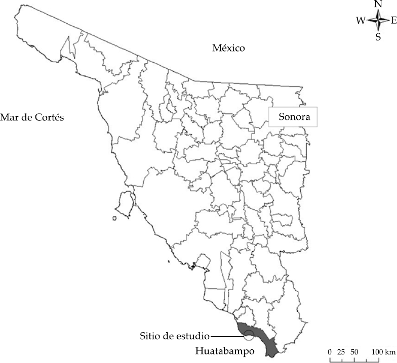 Para análisis posteriores del modelo de evaluación se ha propuesto estudiar un estanque de cultivo mediante el monitoreo del conjunto de parámetros rutinarios: pH, oxígeno disuelto, temperatura y salinidad. Como ya se mencionó, aunque el amonio no ionizado es un parámetro extremadamente tóxico para el organismo, no se realizaron mediciones debido a que éste puede controlarse mediante pH y temperatura (Chien, 1992; Boyd, 2001). La automatización de las mediciones permitió evitar algunos errores de monitoreo, como mediciones fuera de tiempo, mal posicionamiento de sensores o falta de mediciones. Durante el monitoreo de parámetros se presentaron fallas en algún dispositivo, por lo que tales mediciones fueron desechadas del conjunto de datos, generando así un registro más confiable. El proceso de monitoreo fue realizado por el Instituto Tecnológico de Sonora (Itson), en conjunto con el Centro de Investigaciones Biológicas del Noreste (Cibnor), en la granja camaronera “Gez Acuícola”, dentro del ejido “Rancho Chapo”, ubicado en Huatabampo, Sonora, México (figura 2). Los estanques de cultivo son alimentados con agua marina proveniente del estero “El Riito”. Para la recolección de muestras se utilizó un estanque de 5 ha, con dimensiones de 100 m de ancho por 500 m de largo por estanque, con pendiente transversal de 0.1% y 0.1% en sentido longitudinal. El estanque requiere de un recambio de entre 5 y 15% diario de agua; no se contemplaron procedimientos de aeración en el mismo. La frecuencia de medición establecida fue de 15 minutos entre lecturas (4 mediciones/hora), debido a que esta frecuencia es suficiente para observar a detalle las fluctuaciones de cada parámetro. El tiempo de monitoreo en el proyecto se estableció dentro de un periodo de cultivo, correspondiendo a tres meses de almacenamiento de información (junio-agosto de 2007).