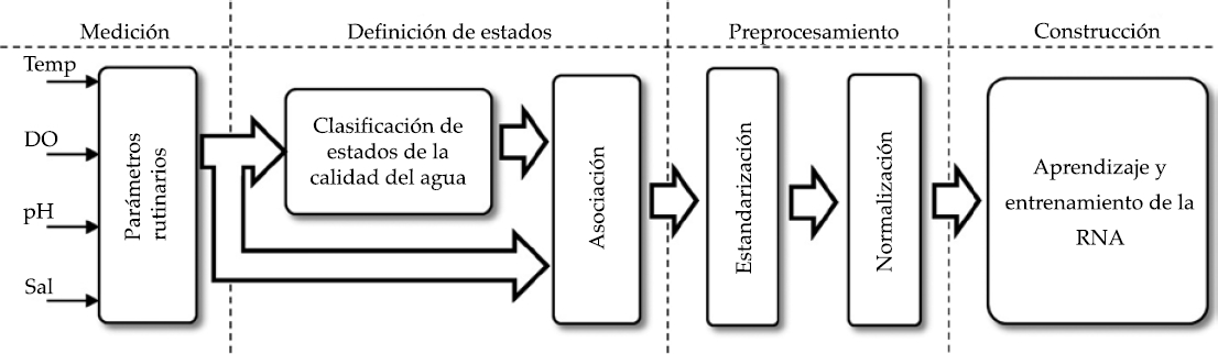 Un modelo neuronal se compone de dos fases: un proceso de aprendizaje y la respuesta durante la puesta en funcionamiento. El proceso de diseño de la RNA requiere de una serie de pasos para poder llevarse a cabo. Esta metodología de aprendizaje se puede observar en la figura 3, donde los valores de los parámetros de la calidad del agua se miden y preprocesan, para después ser clasificados y almacenados en una base de datos. Posteriormente son analizados y clasificados según el tipo de daño o condición de la calidad del agua, generando patrones. Por último, los patrones más representativos se utilizan para entrenar a la RNA, según la respuesta que el experto desea obtener.