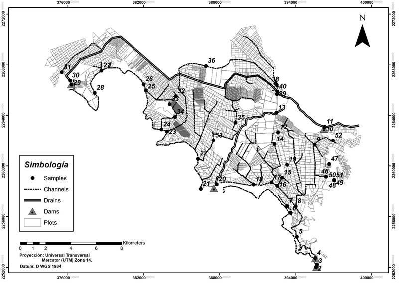 Irrigation district 023 is located between the municipalities San Juan del Río and Pedro Escobedo in the state of Querétaro and has an area of 11 048 ha. The water for irrigation is obtained from the dams San Ildefonso, Constitution of 1917, La Llave, from the border la Venta and 54 deep wells (Cisneros Estrada & Castanedo Guerra, 2014). A random sampling was carried out at 44 points, 1 sample per point, in the supply network of irrigation water in the DR 023: 5 dams, 4 dikes, 3 main channels, 17 lateral channels, 2 sublateral channels, 2 at different points of the San Juan River, 3 intake works, 2 sources of supply and 6 treated water discharges, and 9 points in the drains with location close to some sampling points (table 2). The results shown in this table are explained in detail in the results section.