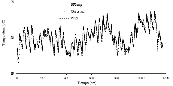 Para analizar y comparar los resultados obtenidos durante las simulaciones se utilizó el método de regresiones lineales R-cuadrado (R 2) y el coeficiente de Nash-Sutcliffe (NS). Un resumen de los resultados se muestra en la Tabla 1 para los valores simulados por los modelos SSTemp y WTS, y la temperatura del agua observada para Turnpike y Turnpike-Meadows en 2004 y Meadows en 2005.