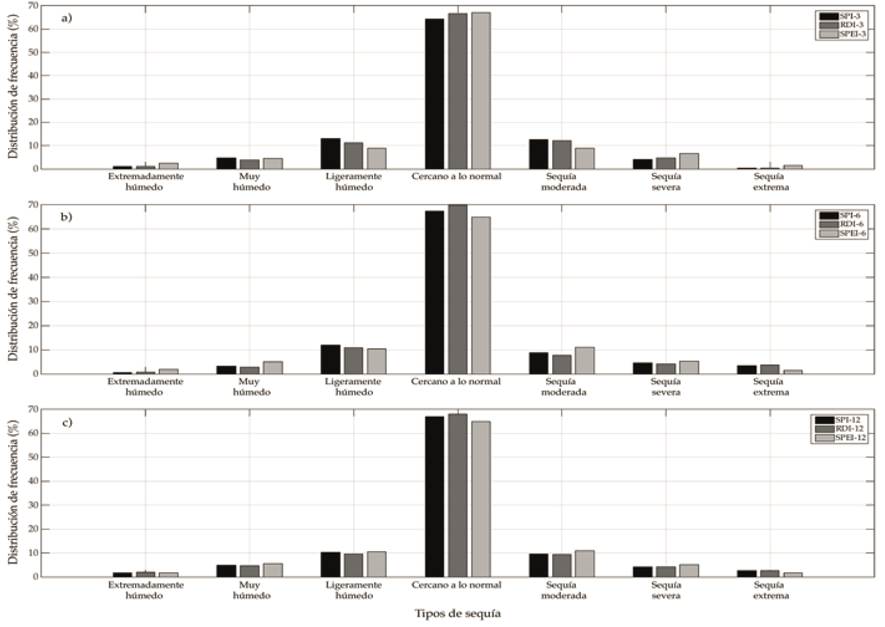The events detected with the three indices had a lower frequency and longer duration as the time scale of the analysis increased. The three scales presented drought events characterized as moderate and extreme, which were of short and medium duration at the 3- and 6-month scales, and of medium to long duration for the 12-month scale. The RDI detected a higher number of droughts at the 3-month scale, while SPI and SPEI did so at the 6- and 12-month scales, respectively.