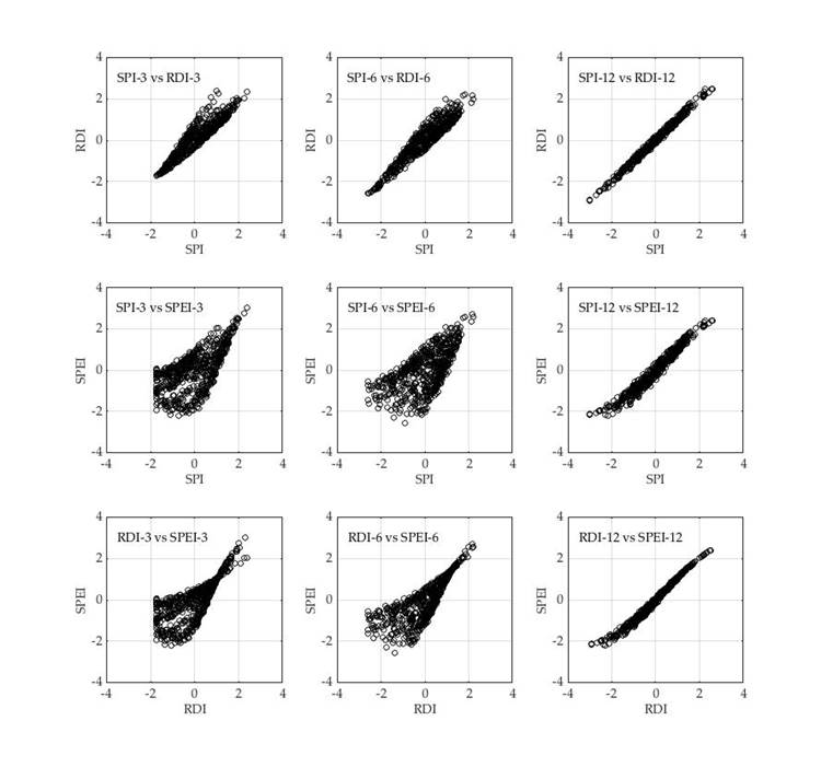 Figure 6 Dispersion diagrams for the SPI vs RDI, SPI vs SPEI, and RDI vs SPEI series for the El Sauz station (32018), period 1961-2012.