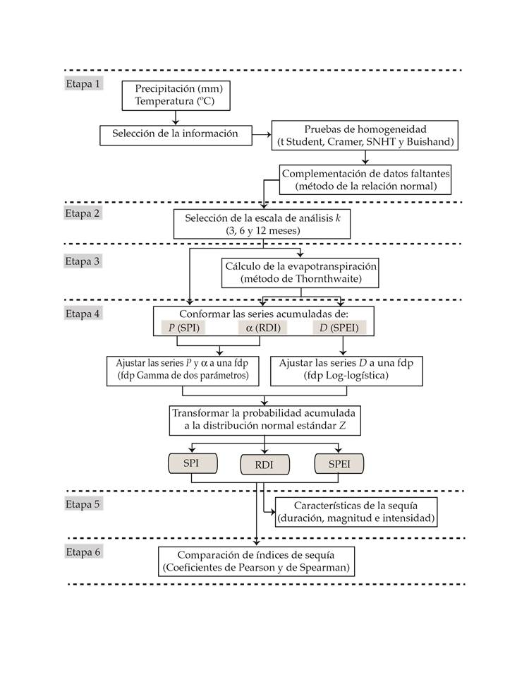 For this study, we used the three drought indices that are most commonly used and well-known worldwide: the Standardized Precipitation Index, the Reconnaissance Drought Index, and the Standardized Precipitation-Evapotranspiration Index. Drought characterization was carried out in six stages: 1) selection and quality control of the climatological information; 2) selection of the scale of analysis; 3) calculation of potential evapotranspiration (ETP); 4) calculation of the SPI, RDI, and SPEI indices at time scales of 3, 6, and 12 months; 5) analysis of drought characteristics; and 6) comparison of the meteorological drought indices. Figure 2 schematically presents the methodological development of the study.