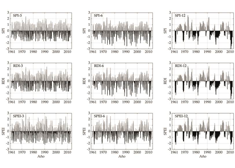 The objectives of this study were to (a) investigate the main characteristics of meteorological droughts in the state of Zacatecas during the period from 1961 to 2012 using the multiscale drought indices SPI, RDI and SPEI; and (b) compare the temporal and spatial behavior of the drought indices used.