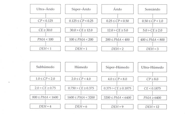 Ponce, Pandey y Ercan (2000) clasifican los climas del planeta en ocho tipos, en función exclusivamente del cociente entre la precipitación media anual (PMA) y la precipitación terrestre global anual (PTGA). Para estimar esta última, indican que la cantidad de humedad almacenada en la atmósfera es función de la latitud y del clima, variando de 2 a 15 milímetros en las regiones polares y áridas a 45 a 50 mm en las húmedas. Un valor medio de 24 mm es adoptado para la estimación de la PTGA, además de considerar que la humedad atmosférica se recicla cada 11 días en promedio, por lo cual ocurren 33 ciclos en el año y entonces la PTGA es del orden de los 800 mm. Designando por CP al cociente entre la PMA y la PTGA, los ocho tipos de climas y sus límites numéricos se indican en la Figura 2.