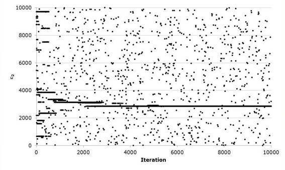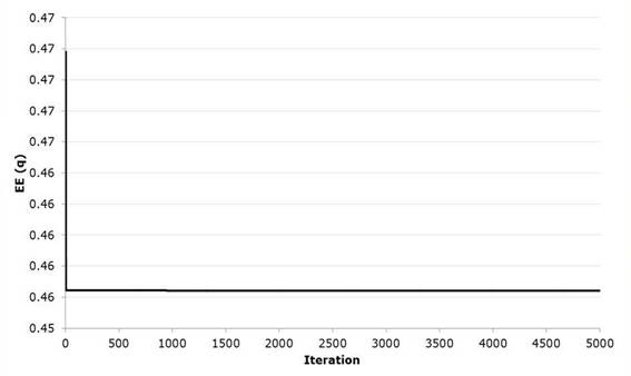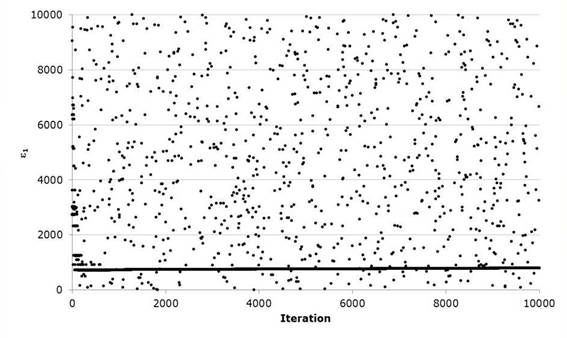 As the optimization of the Gumbel Mixed function develops, we can again appreciate that it decreases the value of the Standard Adjustment Error with respect to the methods at the moment and the Rosenbrock Algorithm. Regarding the latter, the variation is minimal in the result but visually we can see that the adjustment improves its performance in the region of the maximum flows of the series but presents difficulties in the zone of the minimum flows. Likewise, it presents a good convergence performance requiring approximately 2000 iterations of the 10000 performed to optimize the five parameters of the objective function, (the evolution of the iterations can be seen in the Figures 9 and 10) since the difference of equation 17 quickly decreases when evaluating the harmonic harmonics of 40, whereby the parameters ε 1 , ε 1 and ε 2 show greater stability in the stochastic exploration process to define its value optimized unlike ε 2 and P, this last parameter being the one that requires more iterations to identify the minimum in correlation with the rest.