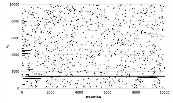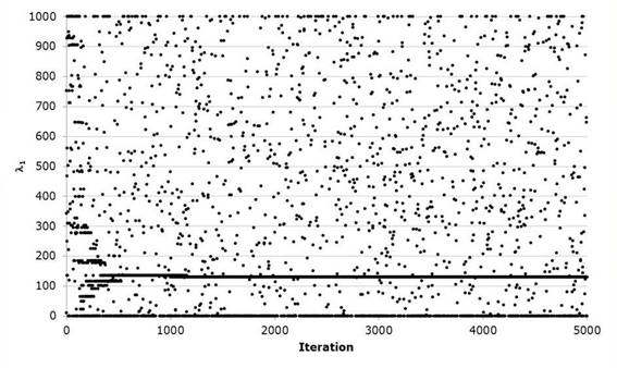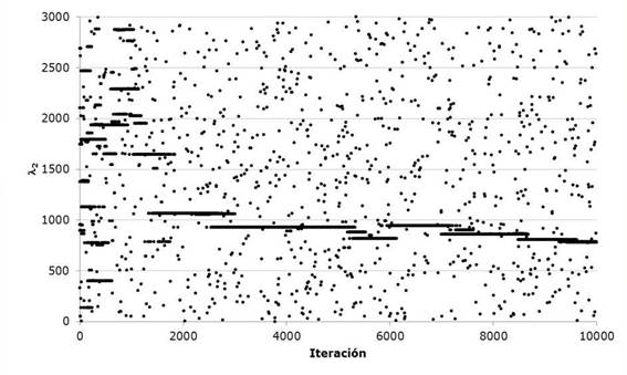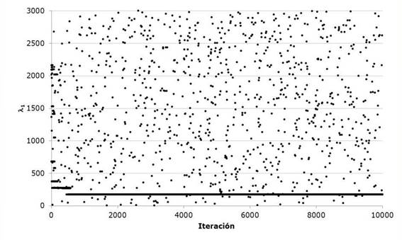Gómez et al., (2010) present a classic example of the numerical adjustment of a Gumbel Mixed distribution. In order to exemplify the proposed procedure, the historical data of station 12504 called La Cuña in the state of Jalisco are used. The parameters of the algorithm were xU=[1, 3000, 3000, 3000, 3000], xL=[1,0,0,0,0], HMS=30, NI=10000, HMCR=0.90, PAR=0.38; B=(xU-xL)/NI to start the pseudo-code of Table 2.