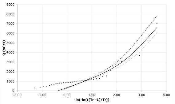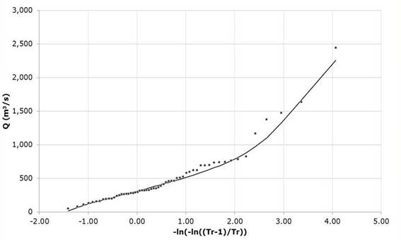 Table 6 Parameters for the Gumbel Mixed function fit for the recording of annual maximum flows of the Santa Cruz hydrometric station, Sinaloa. Mexico.