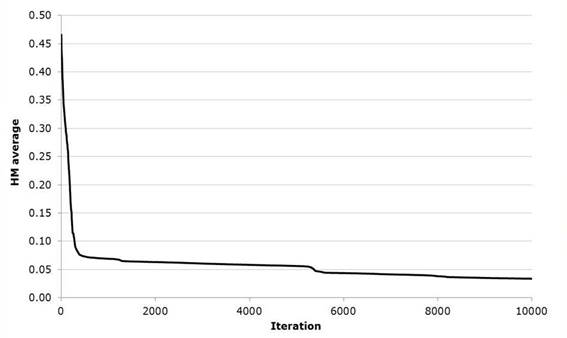 Throughout the total number of iterations the value of the optimization function represented by equation 17 shown in Figure 4 was recorded; in the same way, the optimization function evaluated in the 40 harmonies of the harmonic memory was averaged as shown in Figure 5.