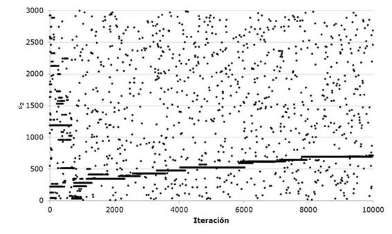 Figures 9 and 10 show the evolution of the value of the optimization function represented by equation 17 for the case of the Gumbel Mixed univariate distribution. The evolution in the solution space of the aleatory search of the harmonics carried out by the proposed algorithm is presented in a sequence in Figures 11 to 15.