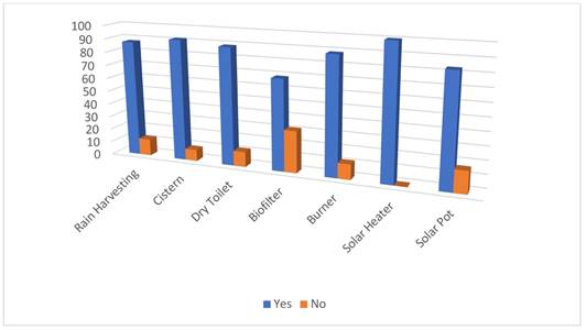 As can be seen in Table 4, of the total of the technologies, between 45 and 50% of surveyed users claim to give them maintenance. According to the results of this survey, such maintenance consists in the activities required by such projects, such as cleaning the canals and roofs in the case of rainwater harvesting systems; emptying and cleaning the chamber in the case of dry toilets, etc.