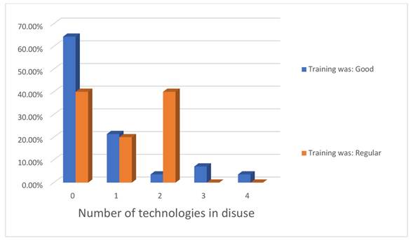When cross-referencing the data from the survey, as shown in figure 11, we may observe that the better the training the users have received on using the technologies, the less likely it is that the technologies will be in disuse. That is to say, it is not enough to provide training (and, as was the case in Chiteje de Garabato that this training was provided to all the people involved), rather the quality of the training is what matters.