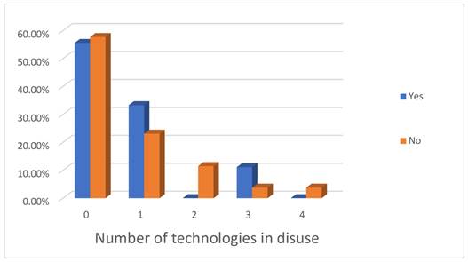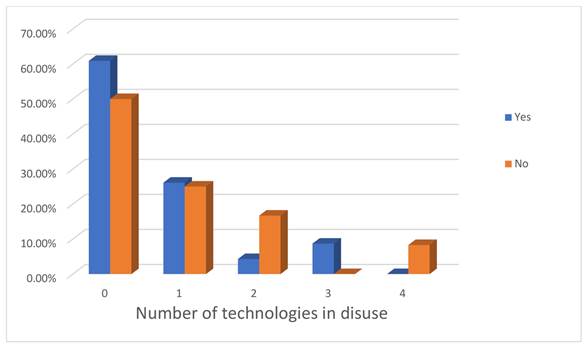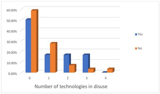 The second case of interaction with the technology is adaptations (the flexibility criterion mentioned by Murphy et al., 2009) made by the users. When the technologies are still in use in a household., little less than half of them have been adapted, as can be seen in Figure 12. It is important to note here that having all technologies operational, or even three in disuse, adaptations have been made to them. The only exception is when there are four technologies in disuse, which may be indicative of lack of interest in the appropriate technologies.