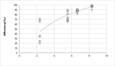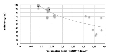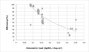 The tendency that describes the behavior between the volumetric load and the efficiency of nitrate removal adjusted appropriately to a logarithmic curve: