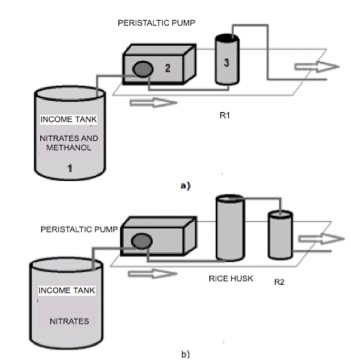 Two similar biological reactors models were built, differing in the carbon source that was added to produce the denitrification process, one of the systems worked with methanol, and the other with rice husk as organic source of energy.