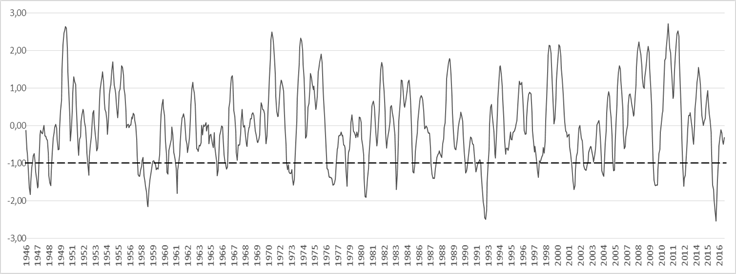 Figure 4 shows the course of the SDI calculated with the six-month accumulated flow series, and Figure 5 shows the twelve-month flow of the Juanchito station. When comparing the graphs, it was found that increasing the grouping reduced the number of events, but resulted in longer events. Additionally, a relationship was observed between hydrological droughts events and the years which experienced the warm phase of the ENSO phenomenon, El Niño, such as 1958, 1977, 1992 and 2016. The effects of the ENSO phenomenon on river flow rates in the country are not negligible; in percentage terms, the main effects on the El Niño phenomenon occur in the Magdalena-Cauca river basin, with an mean reduction of 26% inflow, a mean of 38% in the Cauca river basin, in the Sogamoso and Suarez up to 30%, whilst in the Sumapaz reductions can reach up to 40% and in the Urabá of Antioquia between 30% and 40% (García, Piñeros, Bernal, & Ardila, 2012).