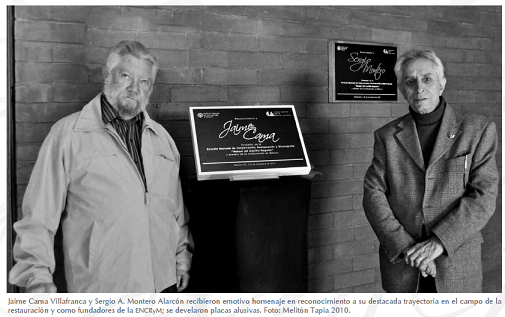 En este año, el INAH y la comunidad académica de la ENCRyM llevaron a cabo emotivas ceremonias en homenaje a la destacada trayectoria de dos fundadores de esta escuela: Sergio Arturo Montero Alarcón y Jaime Cama Villafranca. Mexicano, artista plástico y titiritero el primero; refugiado español, ingeniero civil, joyero y coleccionista el segundo, ambos han compartido una pasión durante media centuria: la restauración.