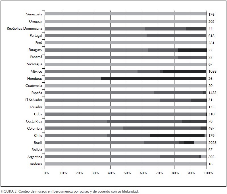 Varios de los organismos centrales promueven el registro de los museos en sus países, algunos mediante censos muy elaborados, como Brasil, Portugal y España; otros como Venezuela, Uruguay, Perú, Nicaragua, Guatemala, Ecuador, Bolivia y Andorra, tienen conteos generales sin indicación del ámbito al que pertenecen.6 A la fecha de este estudio, en Iberoamérica existían 9 129 instituciones museísticas. Nuestro país se encontraba entre los cinco con mayor número de ellas, con 1 058; Brasil ocupaba el primero (2 928), seguido de España (1 455), Argentina (987) y Portugal (618) (Figura 2).