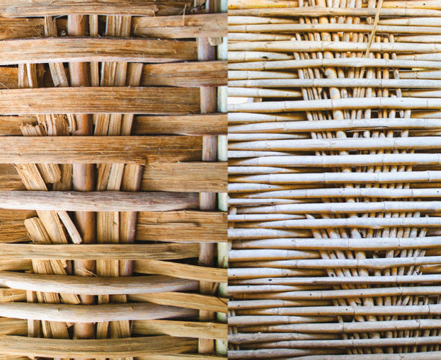 Figura 6 Comparación de dos materiales utilizados para el entramado de muros de pajarete. Izquierda: muro entreverado con majagua; derecha: muro entreverado con otate abierto (rajado)