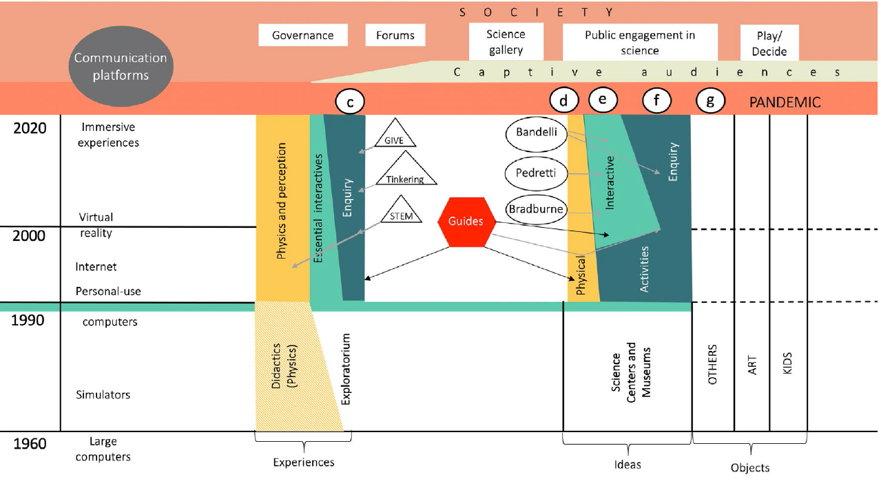 The third panel, “Interactivity and interaction on stage. The Challenge of Technological, Mechanical, and Human Interactivity in the COVID-19 Era” (TDM [Roundtable 3], 2020), dealt with some of the paradoxes regarding the use of technology in museums. The extensive and much-needed timeline on the origins of the use of computers and interactive technologies in museums and science centers (MSC, in the specialized literature) (Figure 3), which was presented by Manuel Gándara (ENCRYM) and María del Carmen Sánchez Mora (Dirección General de Divulgación de la Ciencia-Universidad Nacional Autónoma de México [DGDC-UNAM]) (Figure 4), points out that the use of technology has not fulfilled the social role of the museum and has not gone beyond offering the public virtual access, communication platforms and internet pages. Sánchez Mora said that, even so, it is possible to build joint participatory experiences while linking exact sciences with social problems.