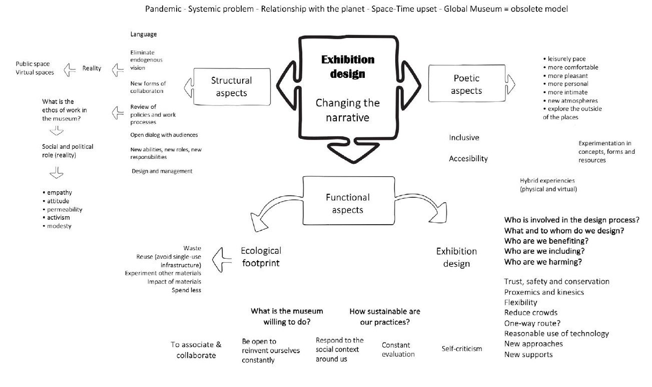 Two questions served as triggers for the discussion. From the first -what have been the effects of the pandemic on museological and exhibition design practice- it is worth noting how it exacerbated and brought to light problems that were already there: implicit hierarchies, lack of a common language between specialists and technicians, structural problems that reveal a lack of policies definition in the various action areas within a museum, which in turn leads to bad practices, with a reactive modus operandi and rigid organizational dynamics, coupled with precarious labor and economic unfeasibility.
