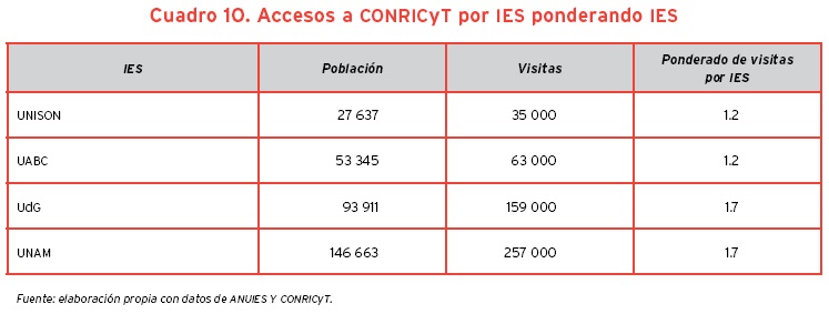 Con la información del cuadro anterior, se puede ponderar el número de visitas a dichos bancos de información por IES.