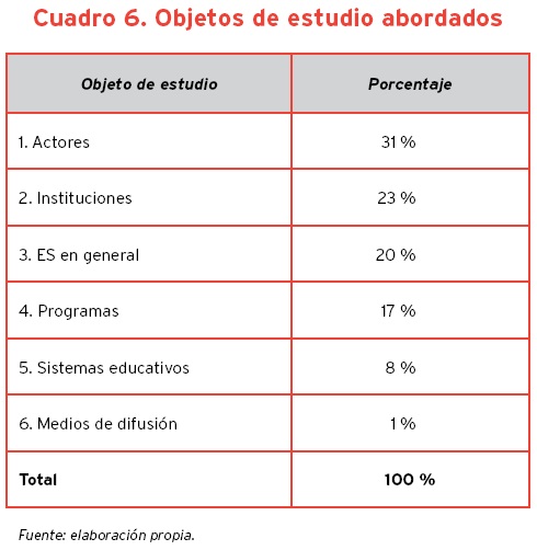 En los casos de una autodefinición no clara del trabajo publicado, revisamos la sección en que se encuentra dentro de la revista y se identificó la estructura del documento para determinar y ubicar el tipo de texto al que correspondía. Otro punto de interés para el análisis del contenido es la identificación de los objetos de estudio que se abordan en los trabajos publicados. La problemática de la educación superior que interesa a la comunidad científica es diversa. Los objetos de estudio tratados en cada texto publicado así lo reflejan, ya que encontramos al menos seis objetos abordados en la proporción que se observa en el cuadro 6. Este cuadro nos indica que los autores se encuentran más interesados en abordar problemas de la ES cercanos a su entorno y en aquellos en que pueden verse involucrados. Los actores, directivos, académicos o estudiantes, son los objetos de estudio más tratados. Sin embargo, también se le da atención a diversos niveles de cobertura de la ES como campo de conocimiento.
