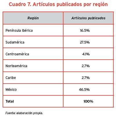Los artículos publicados hasta marzo de 2013 son 88, casi la mitad de autores mexicanos y el resto de países de Iberoamérica (cuadro 7). Se tienen registrados 84 autores, cuatro de los cuales cuentan con dos publicaciones en la RIES.