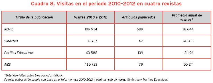 Por el número de accesos registrados, la RIES ha logrado en tres años un posicionamiento y visibilidad aún más altos que los alcanzados por otras revistas académicas con mayor antigüedad en el acervo de revistas especializadas en educación. Para objetivar dicha aseveración hemos comparado el número de accesos en promedio reportados por la RIES en los años 2010 a 2012 con otras tres revistas: Revista Mexicana de Investigación Educativa (REMIE), editada por el COMIE, Revista Sinéctica, editada por el ITESO y Revista Perfiles Educativos, editada por el IISUE.