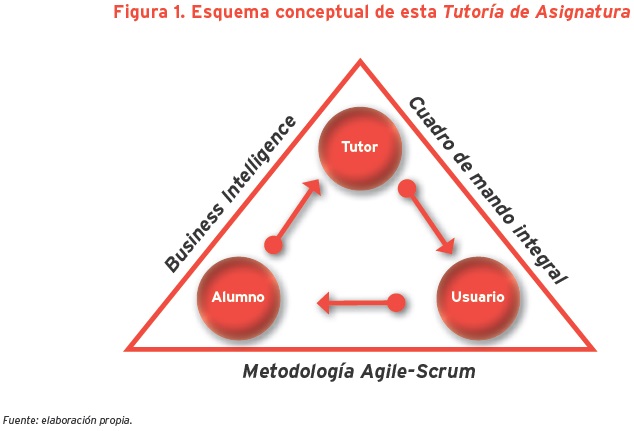 Como puede observarse, los elementos centrales son los alumnos, el tutor y el usuario. Un usuario es aquel directivo o empresario con el que se establece contacto para conocer sus necesidades de información estratégica, involucrando a los alumnos, quienes hacen el diseño y la instrumentación del software con el acompañamiento de su tutor. Las fronteras quedan delimitadas por los principales referentes teóricos sobre los cuales se basa el proyecto.
