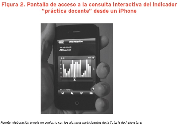 El tipo de consulta es interactivo, es decir, no son pantallas estáticas de información sino que el usuario puede "interactuar" con la información deslizando su mano sobre el dispositivo para seleccionar el nivel de detalle que le interesa, ya sea sobre la asistencia, puntualidad o el indicador "práctica docente". La consulta consiste en un gráfico de barras, en donde cada columna representa el promedio semanal del indicador "práctica docente" de todos los cursos para la unidad de análisis; en la figura 2, la unidad de análisis es el programa "Relaciones industriales". Esta consulta permite realizar un seguimiento por semana del porcentaje general del indicador "práctica docente". En cada consulta puede compararse el valor del indicador de la semana actual con las semanas que han transcurrido del semestre. Una de las principales ventajas de esta consulta de información, es que da la oportunidad al tomador de decisiones, ya sea un coordinador de programa, director de departamento o de división, conocer de inmediato las desviaciones en los indicadores y entrar al nivel de detalle requerido para intervenir. Por ejemplo si un usuario detecta un decremento en el indicador "práctica docente", del 88% al 72%, puede modificar su nivel de detalle para consultar el indicador por materia o profesor, para identificar aquellos elementos que están impactando negativamente en los indicadores generales y tener oportunidad de llevar a cabo acciones, tales como entrevista con profesores o alumnos sobre aspectos particulares del desempeño del profesor. Adicionalmente, el grupo de alumnos tutorados diseñó consultas semanales de manera independiente para cada aspecto del indicador "práctica docente" como asistencia, puntualidad, contenidos, estrategias de aprendizaje y relación interpersonal.