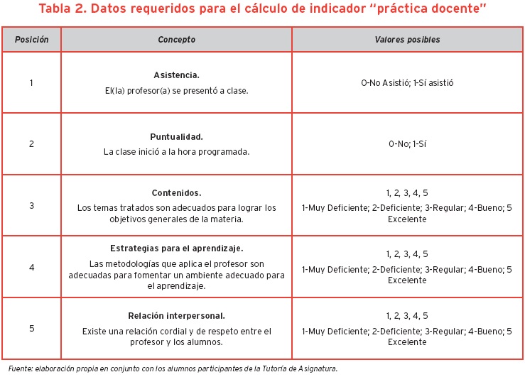 Se estableció un método de medición del indicador "práctica docente" considerando lo que establece el modelo educativo de la propia Universidad, referente a las características del profesor y del proceso de aprendizaje deseado (Universidad de Guanajuato, 2011: 17-18), definiendo un mínimo de datos para su medición. Así, se establecieron cinco datos, cada uno de ellos representado por un dígito, que serán el insumo principal para la construcción de un indicador de "práctica docente", tal como se muestra en la tabla 2.