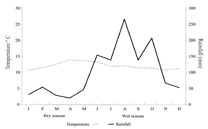 Seasonal variation. We characterized the seasonal variation in the study area by constructing an ombrothermic (rainfall and temperature) diagram (Figure 1). We used the average monthly temperature and rainfall recorded during 2005 - 2007 by the weather station for the Las Vigas de Ramírez municipality, Veracruz, Mexico. The ombrothermic diagram showed that the dry season began in January and ended in May, with an average monthly temperature of 12.30 °C, a rainfall of 235.77 mm (19.5 % of annual total), and an average monthly rainfall of 39.29 mm. January was the coldest month, and a slight increase in precipitation was observed during February. The wet season began in June and ended in October. The average temperature during this season was 11.84 oC, with a rainfall of 973.87 mm (80.5 % of annual total); with an average monthly rainfall of 162.31 mm. April was the hottest and driest month of the year.