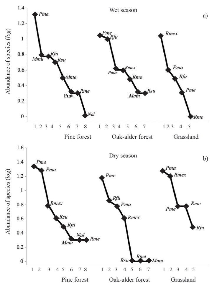 Rodent species dominance differed between vegetation types during the wet season (F 2, 16 = 12.78, P = 0.0005). Rodent species in grassland were less diverse (5 species) than in pine forest (8 species P = 0.0005), or oak-alder forest (7 species P = 0.002). The arrangement of rodent species assemblages varied according to vegetation types and season. During the wet season, the most dominant species was P. melanotis in pine forest, but in comparison oak-alder forest had more dominant species (P. melanotis and R. fulvescens) than did pine forest and grassland (Figure 3a). Pine forest also registered the highest number of rare species (3 species), followed by oak-alder forest (2 species) and grassland (1 species).