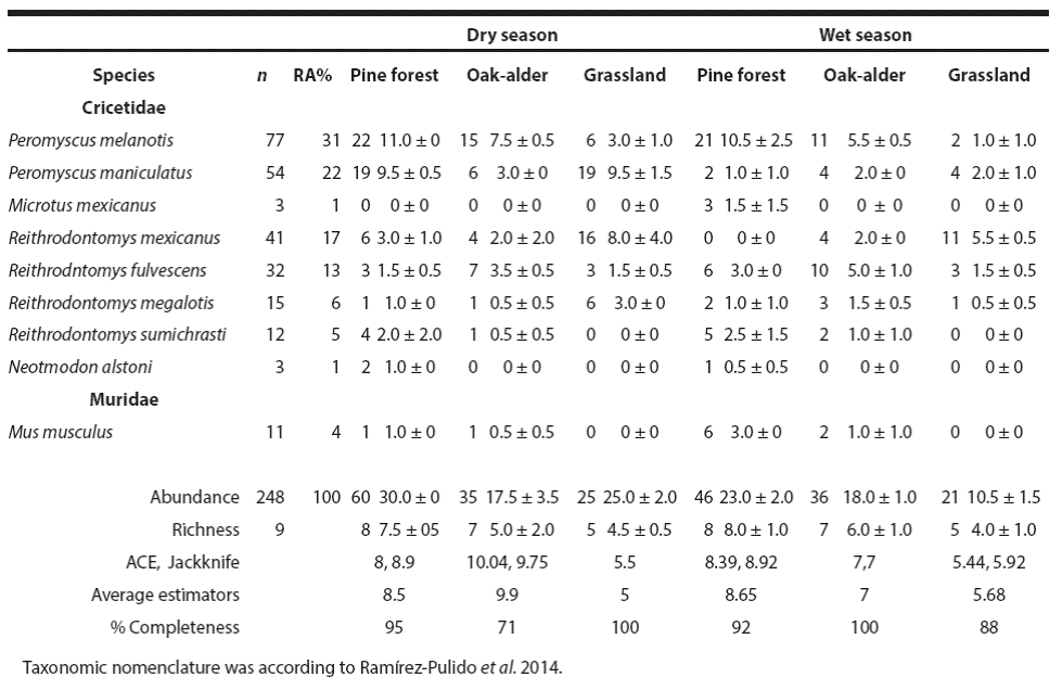 Table 1 Diversity of rodents (n, mean ± SD) captured in the three vegetation types and during the two seasons in a temperate forest in central Veracruz State, Mexico. Numbers of individuals trapped (n), Relative abundance (RA = percentage of captures represented by each species), ACE: Abundance-based Coverage Estimator, Jackknife: is found by systematically leaving out each observation from a dataset and calculating the estimate and then finding the average of these calculations, considering the number of species that occur in a single sample, the number of species and the number of samples. Average estimators: is the average obtained by the sum of the two estimators (ACE and Jackknife) divided between two. The % of completeness was calculated as follows: Richness*100/Average estimators.