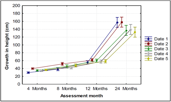 A lo largo del período de evaluación, la fecha que corresponde al 15 de julio (F2) presentó mayor crecimiento en altura respecto al resto de las fechas de plantación, desde la evaluación a los cuatro meses, el ANOVA de medidas repetidas reveló diferencias altamente significativas (p<0.0001), por lo tanto, para cada período evaluado, se puede observar que existen diferencias significativas a los 8 y 24 meses (Tabla 2), donde, F2 sobresale desde el inicio (altura inicial promedio de 35.81 cm) con diferencias de 10 a 90 cm entre cada periodo de evaluación, en este caso, la fecha de plantación tuvo un efecto significativo en la altura total.