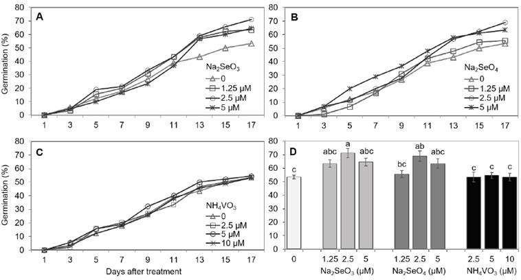 Figura 1 Porcentaje de germinación de semillas de chile serrano expuestas a diferentes concentraciones de Na2SeO3 (A, D), Na2SeO4 (B, D) y NH4VO3 (C, D). Los datos presentados en la subfigura D representan la comparación entre tratamientos del último día de registro de datos (día 17). Medias con letras diferentes indican diferencias significativas de acuerdo a la prueba de Duncan (p < 0.05), ± desviación estándar.