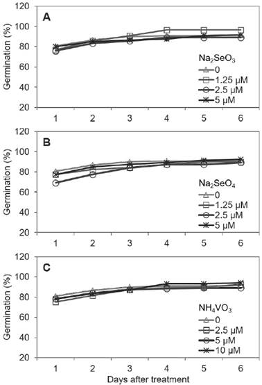 Figura 2 Porcentaje de germinación de semillas de rábano expuestas a diferentes concentraciones de Na2SeO3 (A), Na2SeO4 (B) y NH4VO3 (C). Las diferencias estadísticas entre tratamientos no son significativas (p > 0.05).