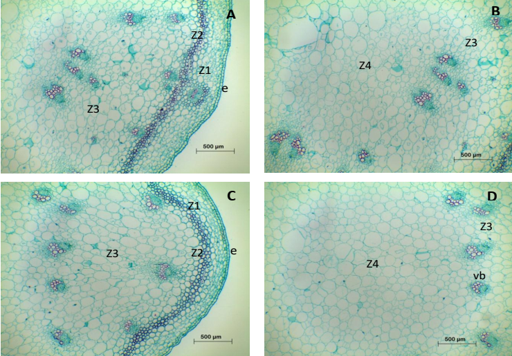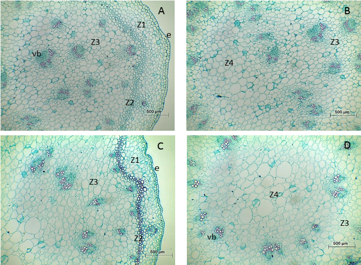 A partir de los 20 y hasta los 60 cm, en el eje caulinar, la Z1 tiene células ligeramente aplanadas y sus estratos del parénquima disminuyen a seis, los haces vasculares se muestran más escasos en sentido basípeto. En la Z2 las células se van lignificando, hasta formar tejido esclerenquimático que se evidencia a los 20 cm. Este tejido forma un anillo continuo de tres a cuatro capas de células que rodean a numerosos haces vasculares. En la Z3 los haces vasculares (vb) van disminuyendo en número, pero tienen mayor área en sentido basipétalo. A 20, 40 y 60 cm, las células del parénquima de la Z4 aumentan su tamaño hacia el centro y se observan espacios que se generan por la separación de las paredes celulares. Estos espacios no se observan a 2 cm (Figura 1; Figura 2).