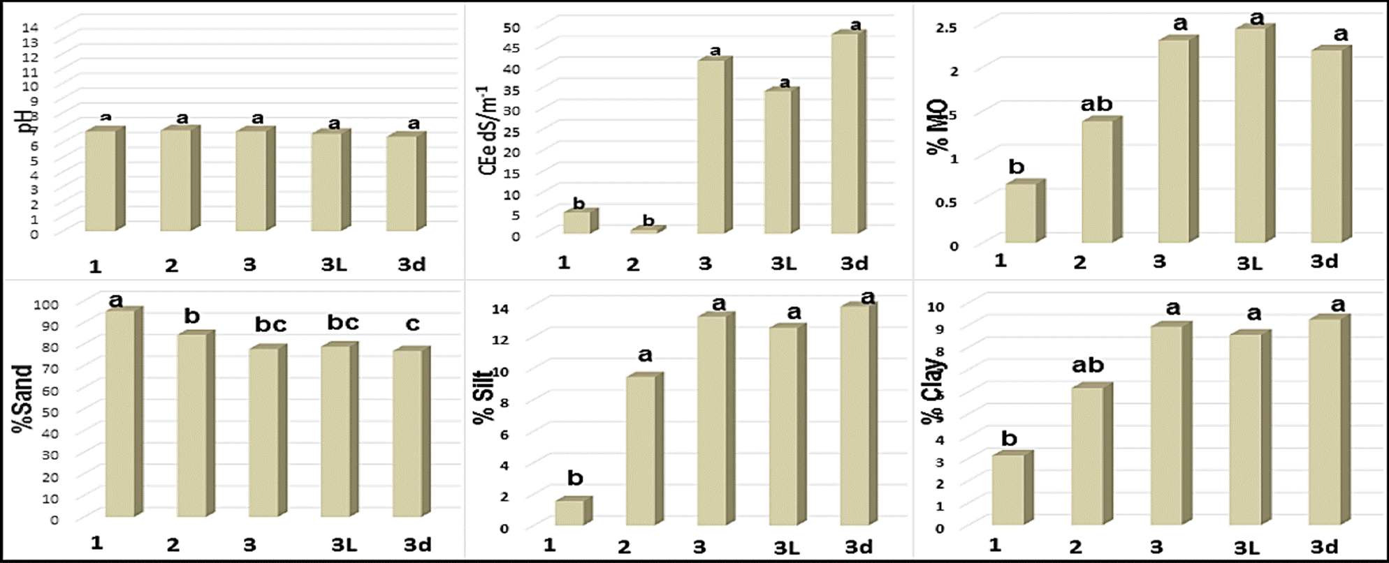 Figura 2 Comparación de medias de las propiedades del suelo en diferentes geoformas de marismas. Los histogramas corresponden a los valores medios de las propiedades del suelo. Las letras indican diferencias significativas entre geoformas por la prueba de Tukey (p<0.05). 1=Playa y duna costera, 2=Barra alta no inundable, 3=Barra media con inundación estacional, 3L=Loma de barra media con inundación estacional y 3d=Depresión de barra media con inundación estacional.