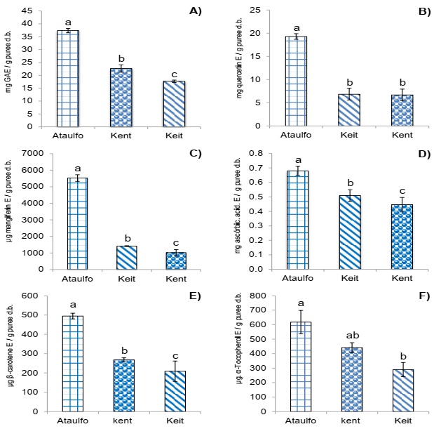 En la Figura 1F se presenta la concentración de tocoferoles totales, se observa que el cultivar Ataulfo presentó la mayor concentración con 620 µg E. α-tocoferol/g de pasta p.s. (p<0.01), este resultado de la pasta cultivar Ataulfo es mayor a lo reportado por Corral-Aguayo et al. (2008), quienes determinaron la concentración de tocoferoles en 550 µg/100 g de pulpa.