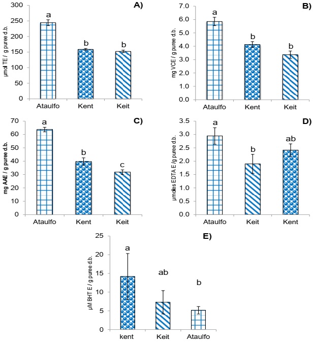 En la Figura 1D se muestra la actividad quelante de los cultivares analizados, en esta figura se observa que el cultivar Ataulfo presentó la mayor actividad con 2.9 µmoles EDTA/g de pasta p.s. y la de menor actividad fue el cultivar Keit con 1.9 µmoles EDTA/g de pasta p.s., mientras que, el cultivar Kent fue similar a ambos (p<0.01). Se observa en la Figura 2E que el cultivar Kent presentó la mayor protección ante la oxidación de la emulsión con 14.2 µM E BHT/g de pasta p.s., mientras que, el cultivar Ataulfo con 5.1 µM E BHT/g de pasta p.s. fue el que menos actividad antioxidante presentó, el cultivar Keit fue estadísticamente similar a ambos casos (p<0.01).