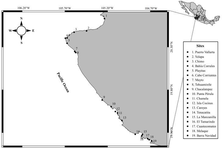 Se realizaron campañas de muestreo en 19 localidades distribuidas a lo largo de la costa de Jalisco (Figura 1) durante todos los meses del año, desde 2000 hasta 2018 (19 años). Sin embargo, las recolectas más intensivas fueron de marzo a junio, que abarcan la estación de secas, y de septiembre a noviembre en la temporada de lluvias. Las recolectas se realizaron a lo largo de las zonas intermareales, submareales y someras (<10 m de profundidad). El buceo libre (snorkel) se utilizó durante recolecciones directas en aguas poco profundas (<3 m), mientras que el buceo SCUBA se implementó en áreas más profundas (<15 m). Los datos ambientales, como la exposición al oleaje, la profundidad, el hábitat específico (poza intermareal, canal de corriente, la plataforma rocosa o el acantilado) y el tipo de sustrato se asociaron a cada espécimen.