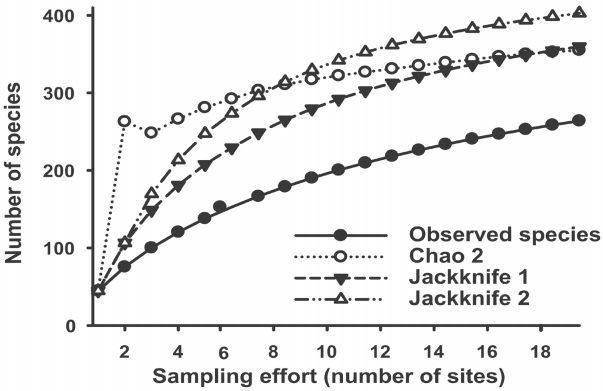 Todas las curvas de acumulación de especies tendieron hacia la asíntota, lo que indica una buena representación del esfuerzo de muestreo en las 19 localidades seleccionadas de Jalisco. (Figura 2). Las especies observadas (263) representaron entre 65 y 74 % del número teórico de especies esperadas, con un valor promedio de 70 %. El estimador de Jackknife 2 tuvo el mayor número de especies esperadas con 403 especies y, por lo tanto, la representación más baja (66 %), mientras que Jackknife 1 y Chao 2 tuvieron valores intermedios de 359 (73 %) y 355 (74 %) especies esperadas, respectivamente. Las diferencias en el número esperado de especies se deben a la alta variabilidad de las especies registradas junto con fuertes diferencias en la escasez de especies entre las localidades.