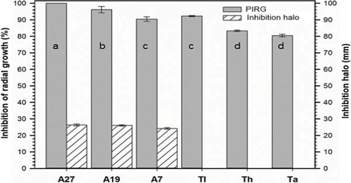 Figura 1 PIRG y halo de inhibición de antagonistas vs C. theobromicola. Streptomyces sp. (A7), Streptomyces tubercidicus (A19), Streptomyces viridochromogenes (A27), Trichoderma asperellum (Ta), Trichoderma harzianum (Th) y Trichoderma longibrachiatum (Tl). Las barras con mismas letras no son estadísticamente diferentes (Tukey, 0.05).