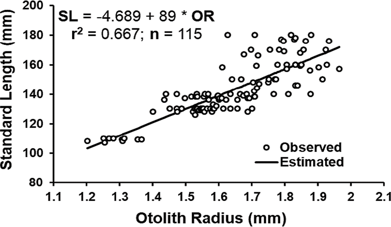 En la Figura 2 se muestra que la relación entre el radio del otolito y la longitud patrón de O. medirastre es de tipo lineal, con un coeficiente de correlación significativo (r = 0.817, t = 15.05 p < 0.001) y un coeficiente de determinación del 0.667. Lo anterior demuestra el crecimiento proporcional del otolito con el tamaño del pez, aunque el coeficiente de determinación indica que el 33.3 % de la variación en la talla es explicada por otro factor independiente del tamaño del otolito. En estudios de crecimiento en peces se ha observado que los coeficientes de determinación para la relación tamaño del otolito tamaño del pez varían desde 0.4 a 0.9 (Carmona & Alexandres, 1994; Quiñonez-Velázquez et al., 2002; Puentes-Granada et al., 2004; Morales & González, 2010; Pajuelo & Lorenzo, 2011; Souza-Conceição & Schwingel, 2011; Cerna et al., 2014). La proporcionalidad del otolito con la talla del pez es muy importante cuando se requiere hacer un retrocálculo de tallas pretéritas y entre mayor precisión se tenga es mejor, especialmente porque en algunos casos se presenta reabsorción de anillos (Fenómeno de Lee), sin embargo en este estudio no se realizó el retrocálculo, debido a que se tuvieron bien representadas los organismos de las primeras edades. Los otolitos solo fueron examinados para observar las bandas de crecimiento hialinas y opacas, las cuales se pueden presentar independiente de la proporcionalidad del otolito con la talla del pez. Los otolitos ya se han usado para la determinación de edad en especies de Opisthonema (Carmona & Alexandres, 1994; Ruiz-Domínguez & Quiñonez-Velázquez, 2018).