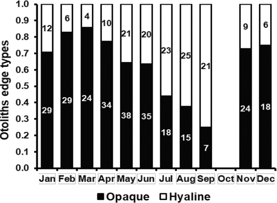 La proporción mensual de otolitos con bordes opacos e hialinos describió un ciclo anual; la mayor proporción de bordes hialinos se registró en septiembre (0.75), mientras que la mayor proporción de opacos en marzo (0.86) (Figura 3). La mayor proporción de bordes opacos coincide con el periodo de máxima concentración de clorofila-a que se presentan de enero a junio en la costa entre Sinaloa y Cabo Corrientes, Jalisco, donde opera la flota sardinera (Cepeda-Morales et al., 2017). La disponibilidad de fitoplancton o zooplancton en estos meses de alta concentración de clorofila-a, representan una alta disponibilidad de alimento para O. medirastre y por tanto un rápido crecimiento que está asociado con la formación de las zonas opacas del otolito. En agosto-septiembre se presenta el máximo reproductivo de esta especie (Cotero-Altamirano et al., 2014) y coincide con el periodo de baja concentración de clorofila-a (Cepeda-Morales et al., 2017). Estos dos eventos representan una baja disponibilidad de alimento y una derivación de la energía hacia la maduración de la gónada, respectivamente, coincidiendo con la fase de lento crecimiento y la formación de la zona hialina del otolito. La constancia de estos dos periodos puede variar interanualmente, sin embargo la Figura 3 representa un promedio de tres años con diferentes características ambientales (El Niño, La Niña y Neutral), por lo que se puede afirmar que en promedio una banda opaca y una hialina se forman anualmente.