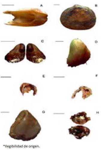 Figura. 2 Bivalvos asociados al ostión de roca Striostrea prismatica en playa Corrales, Jalisco, Cabo Corrientes, México. A. Leiosolentus aristatus*. Barra de escala = 2 mm. B. Divalinga perparvula. Barra de escala = 0.5 mm. C. Brachidontes adamsianus. Barra de escala = 2 mm. D. Zeptifer zeteki. Barra de escala = 0.5 mm. E. Chama coralloides. Barra de escala = 10 mm. F. Chama echinata. Barra de escala = 10 mm. G. Pinctada mazatlanica. Barra de escala = 1 mm. H. Striostrea prismatica. Barra de escala = 10 mm.
