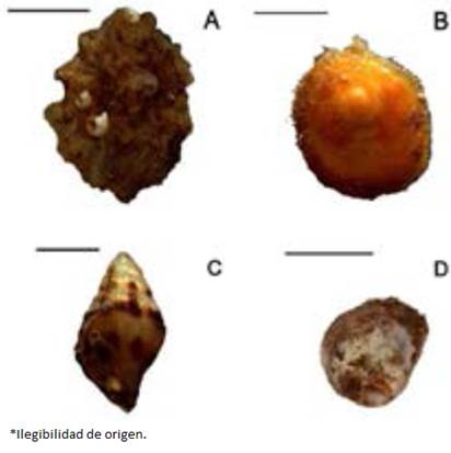 Figura. 3 Gasterópodos asociados al ostión de roca Striostrea prismatica en playa Corrales, Cabo Corrientes, Jalisco, México. A. Crucibulum concameratum. Barra de escala=2 mm B. Pilosabia trigona. Barra de escala=2 mm. C. Parvanachis pygmaea. Barra de escala=0.5 mm. D. Crepidula excavata. Barra de escala=10 mm.